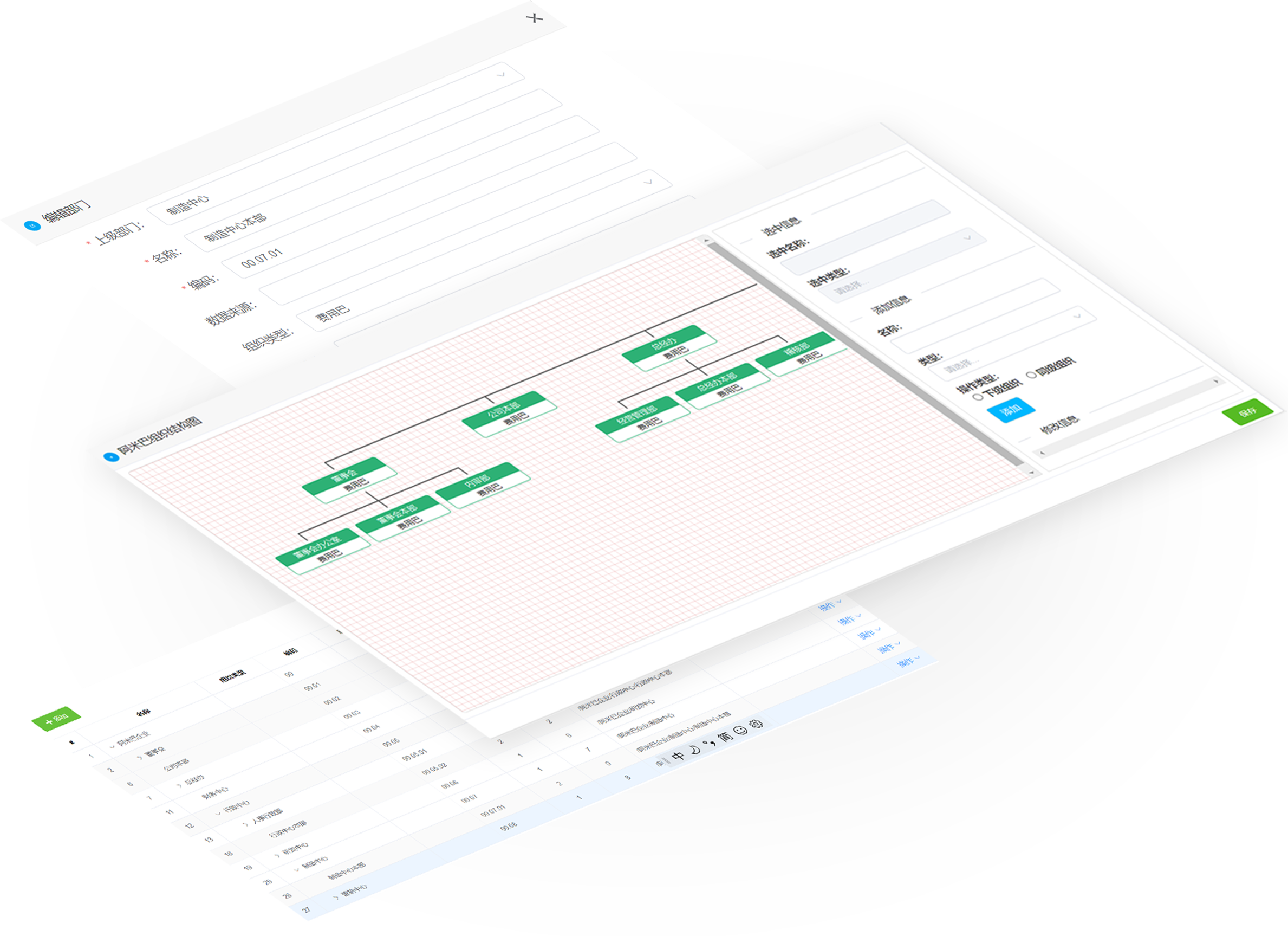 软件提供组织架构图、数据列表两种方式进行阿米巴组织的增加删除、修改操作