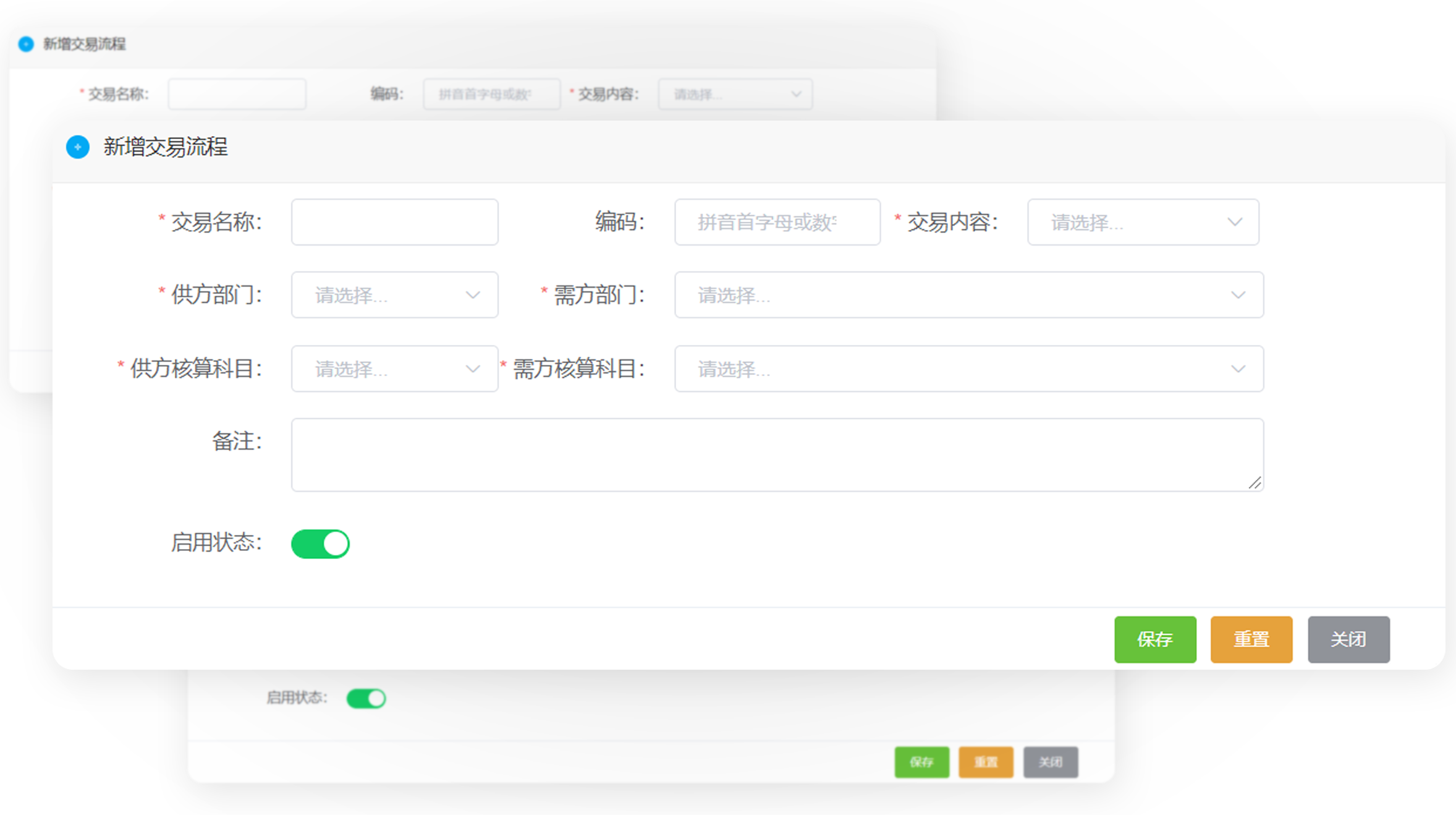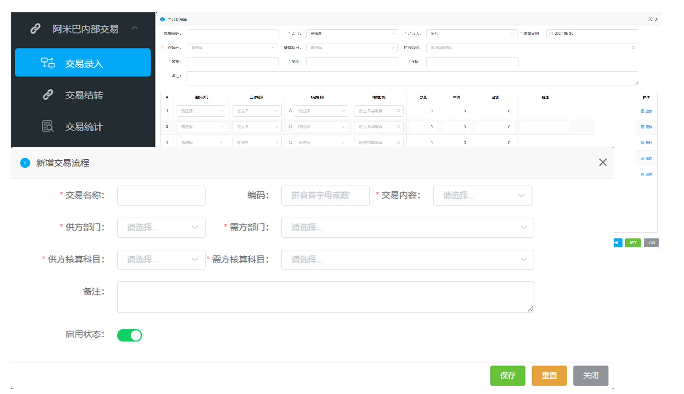 设置交易的买方、卖方,交易内容(产品、半成品、服务等)、交易定价、交易双方的核算科目