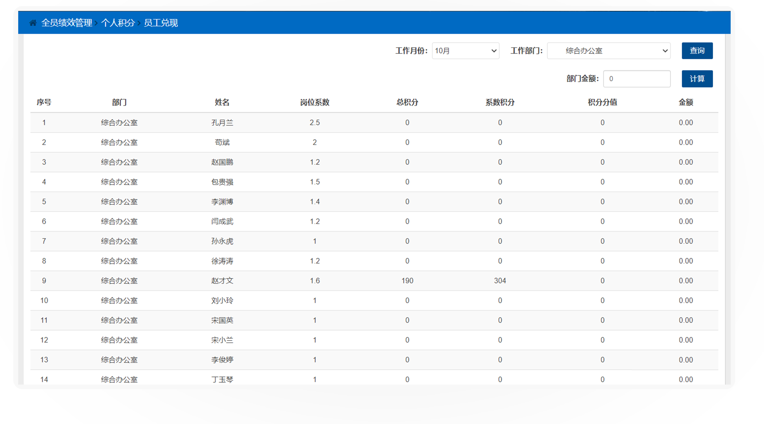 员工兑现是在部门兑现金额确定后,依据员工的积分、岗位系数、分配系数等参数计算员工兑现金额