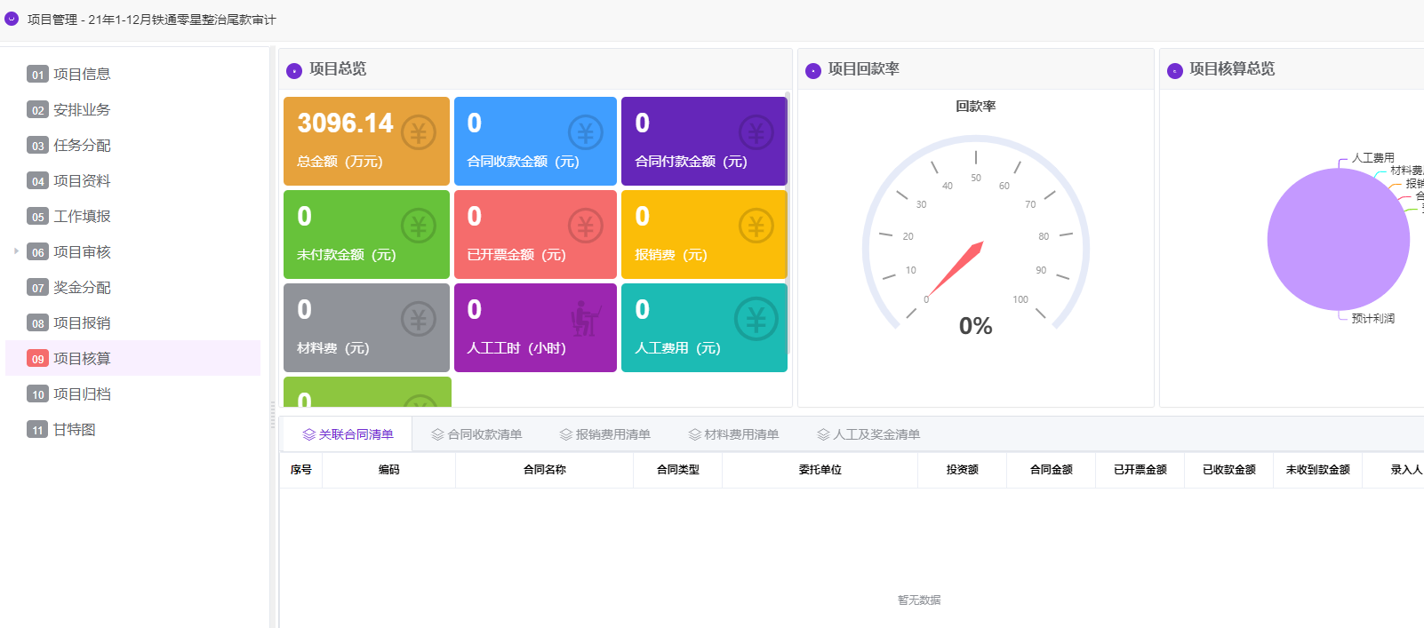 项目核算模块中的项目总览对项目金额、已收款金额、未付款金额、已开票金额、项目报销及人工等信息进行集中展示