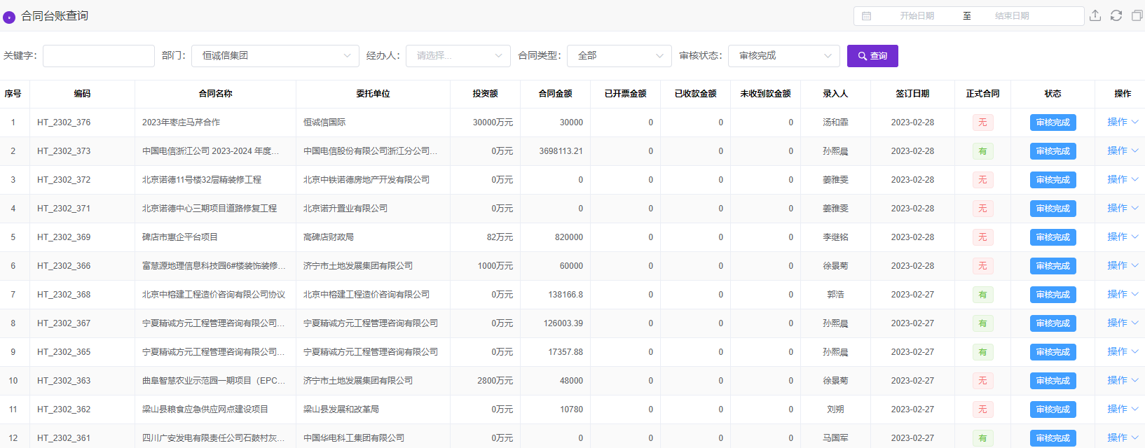 合同台账查询,实时查询合同的已开票金额、已收款金额、未收款金额等
