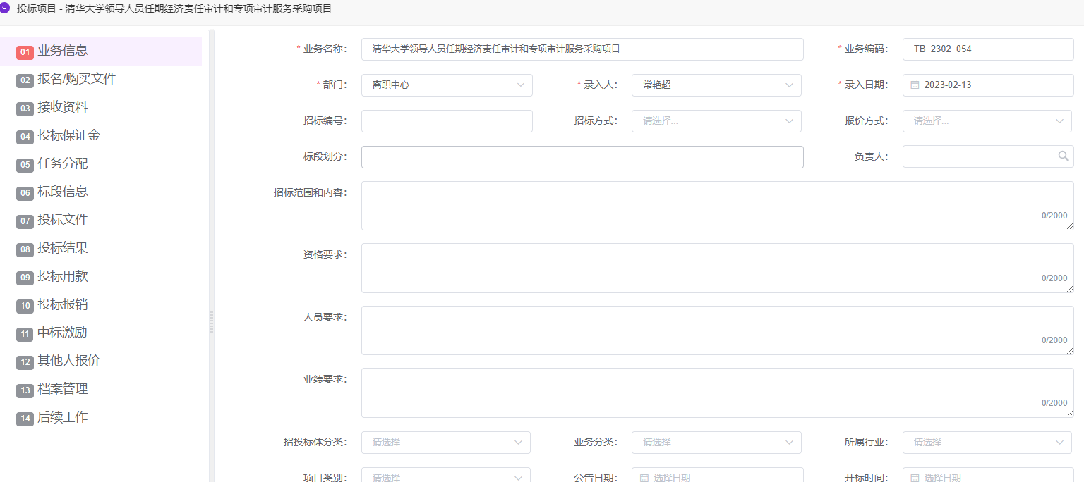 项目投标过程的管控,从投标前期(业务基本信息、报名/购买文件、接收资料、投标保证金),投标中期(任务分配、标段信息、投标文件),投标后期(投标结果、中标激励、其他人报价、档案管理、后续工作)